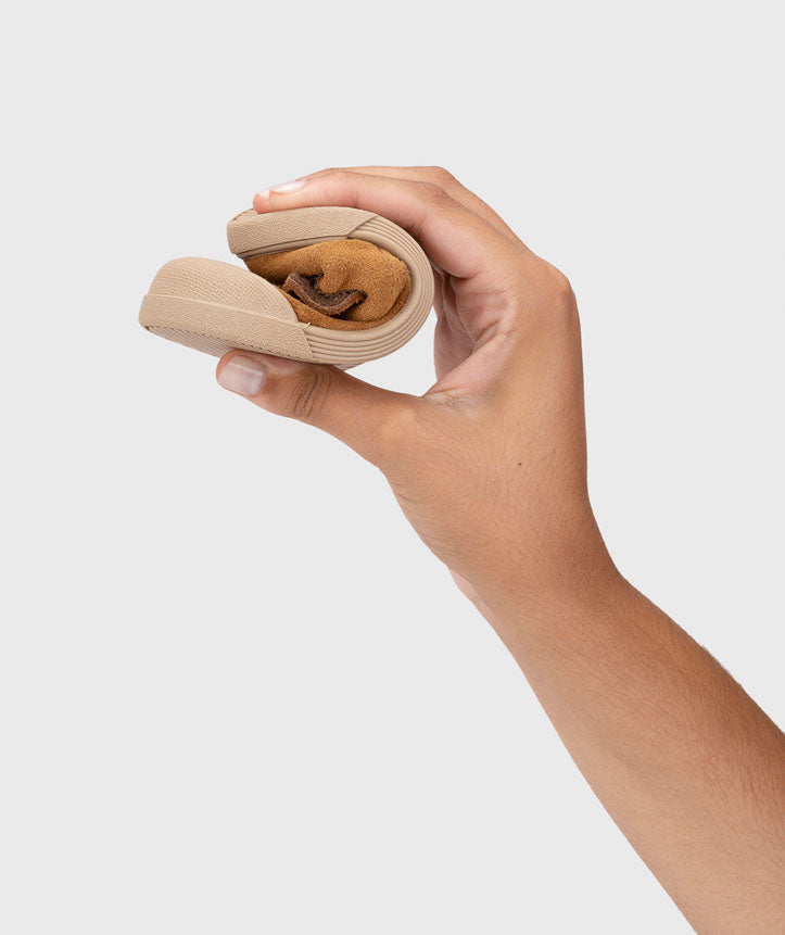 Botín de serraje de concepto barefoot, cero drop, flexible y blandito, plantilla acolchada extraíble y cierre adherente para mayor ajuste y autonomía.