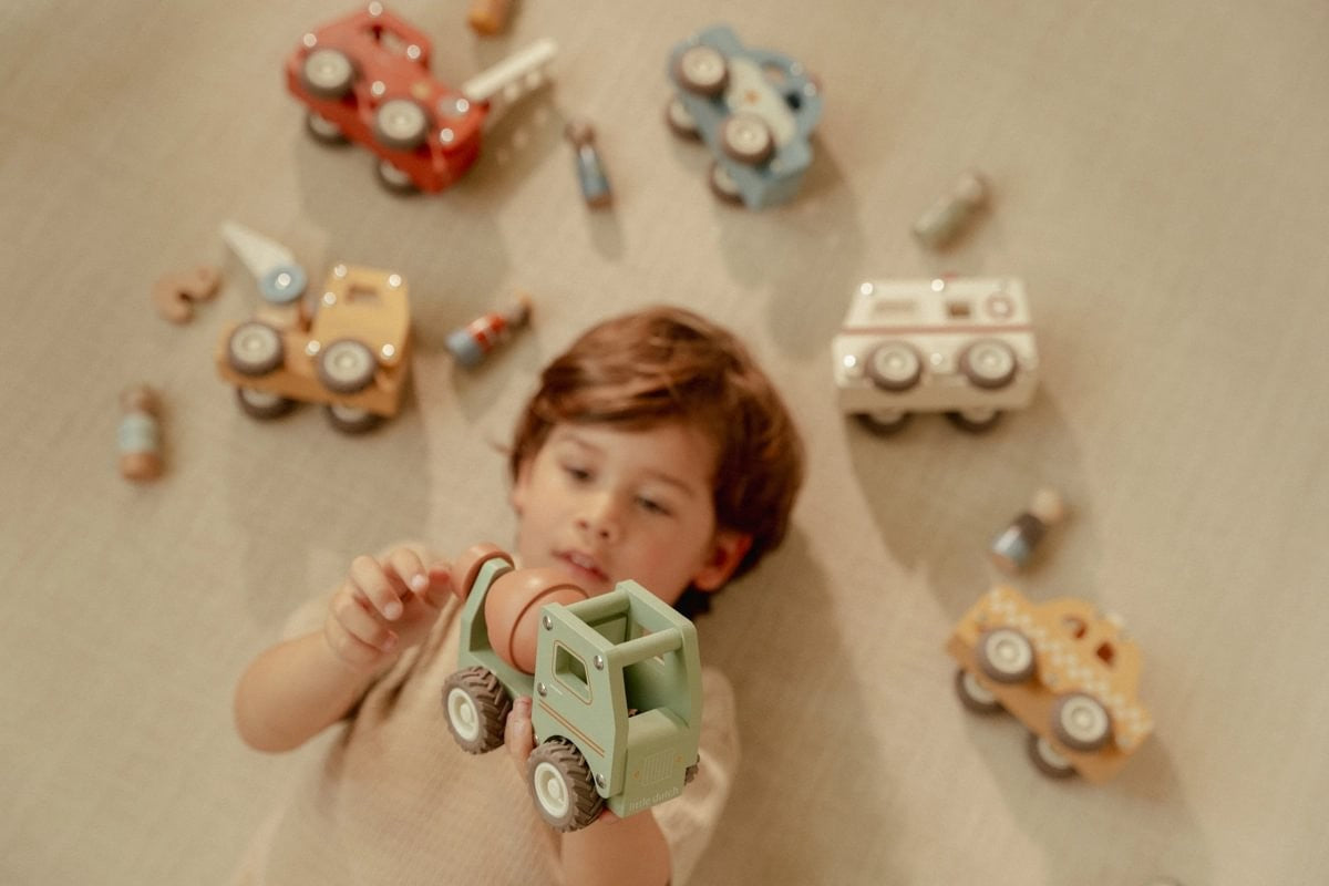 ¡Mezcla y construye! Este camión de cemento de madera gira su mezcladora mientras recorre la obra. La minihormigonera incluye un trabajador de construcción de madera y ruedas de goma para mayor comodidad al conducir. Conduce hasta la obra, vierte el hormigón y allana los caminos por completo. Combínalo con la excavadora y el camión dúmper de madera para una experiencia de construcción completa.