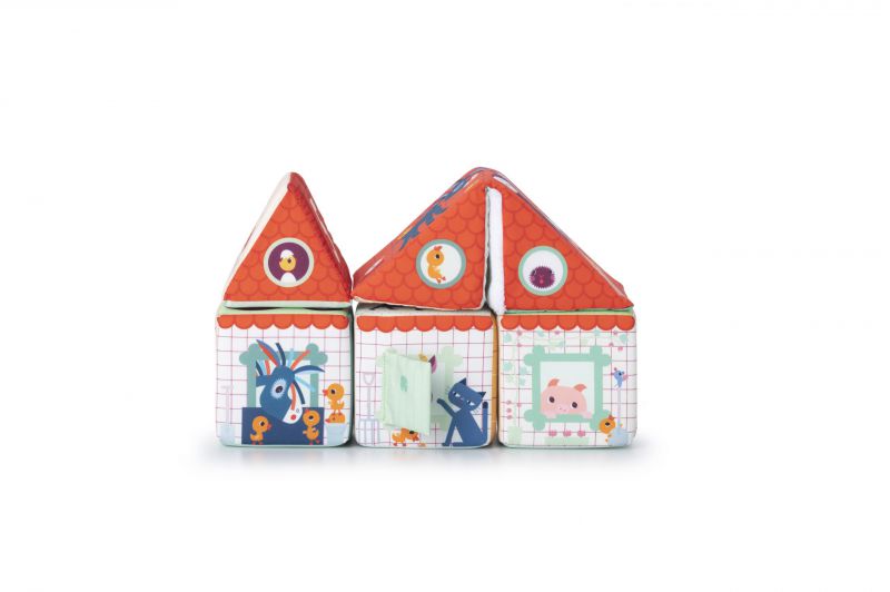 Este juego de 5 cubos mullidos presenta un nuevo reto en cada cara. Ensamblado de una casa de granja, los animales de la granja, las cifras, descubrimiento de diferentes materiales Un juego original y estimulante para las manos y el cerebro.