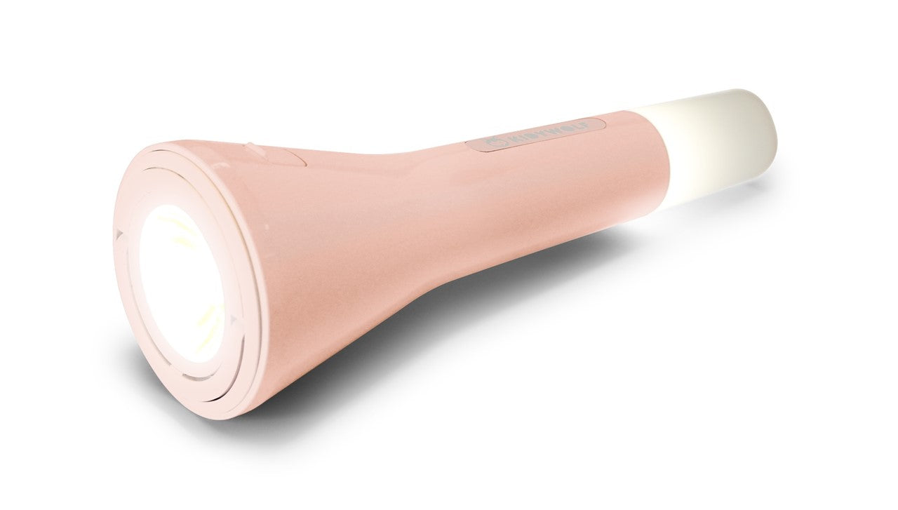 - Lámpara de noche o luz quitamiedos: su forma permite colocarla de pie sobre su base y mantenerla sobre una superficie firme como lamparita. Tiene 3 niveles de intensidad regulables: 100%, 60% y 20%.
