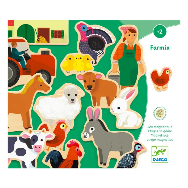 -Una caja de 24 piezas magnéticas de madera sobre el tema de la granja.