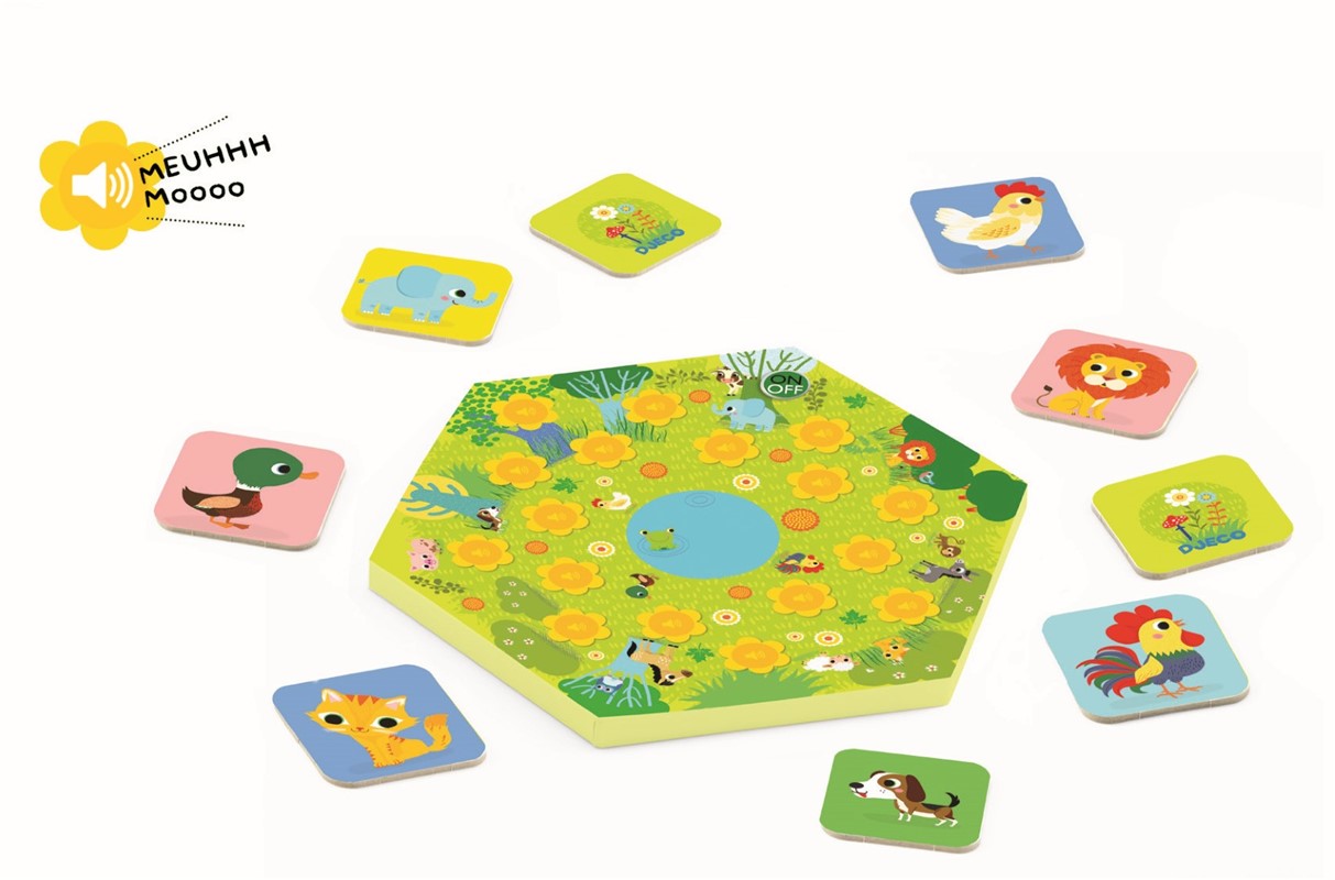 Un divertido juego de memoria ¡sonoro! Colocad todas las cartas de animales bocabajo, alrededor del tablero sonoro. El primer jugador dará la vuelta a una de ellas, observará el animal y pulsará una flor del tablero. ¿El sonido coincide con el animal? ¡Bien! Coloca una ficha roja encima de la flor y llévate la carta del animal. ¿No coincide con el animal? ¡Ups! No pasa nada. Damos la vuelta a la ficha y el turno pasa al siguiente jugador. Quien consiga más cartas de animales ¡gana la partida!