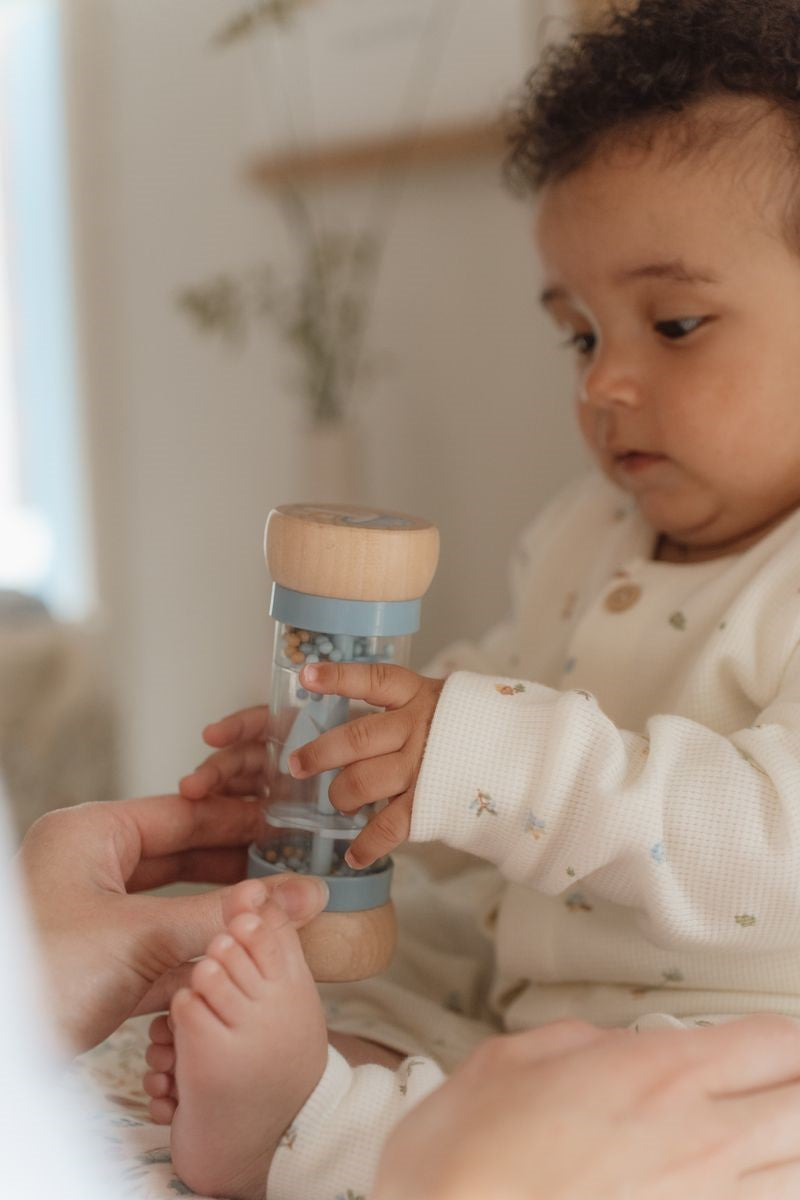 ¡Sacude y traquetea! Dale la vuelta al sonajero de lluvia y las gotas se moverán hacia el otro lado haciendo suaves sonidos de gotas de lluvia. Estimulará el desarrollo sensorial y el talento musical del bebé. Las perlas en 3 colores diferentes caen por el tubo a través de pequeñas aberturas y hacen girar la hélice, dando como resultado un sonido agradable. El sonajero de lluvia está diseñado para manos pequeñas y de fácil agarre. La parte superior e inferior de madera están ilustradas con una flor y una mariposa de la colección Little Dutch flores & mariposas