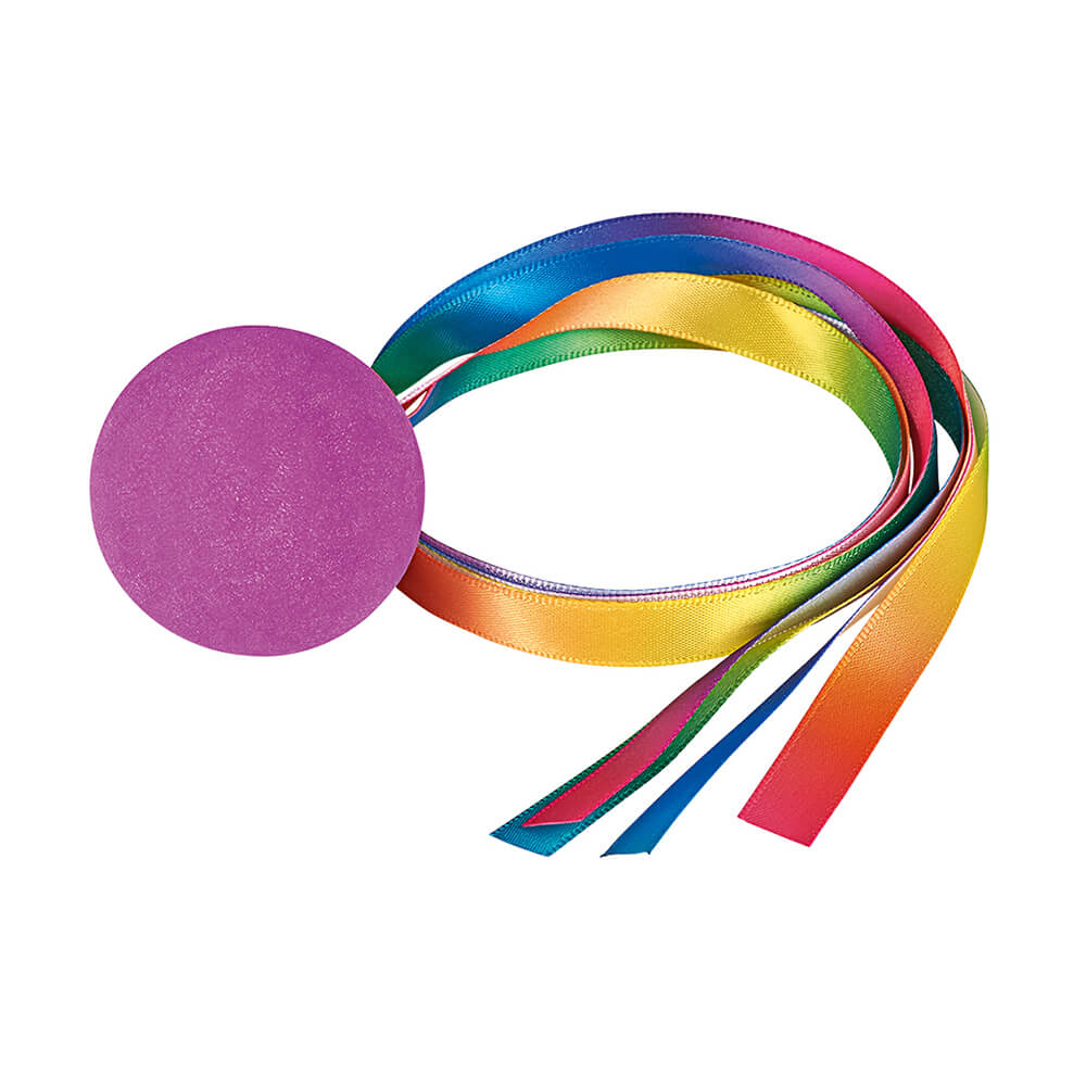 Pelota de goma con cintas de colores de unos 45 cm de largo. Pelota Ø aprox. 4,3 cm