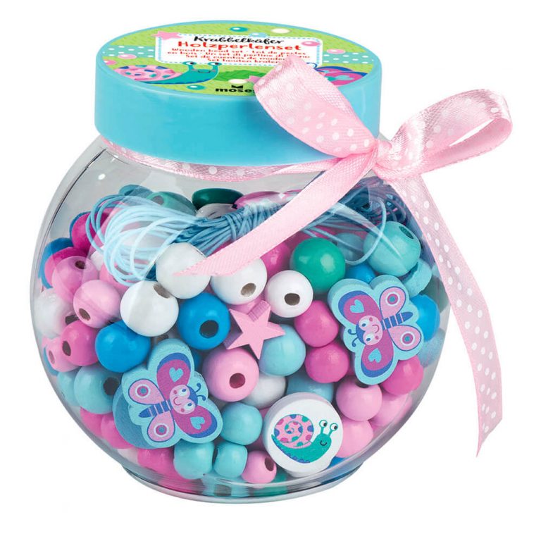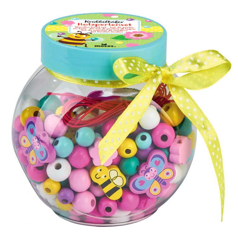 252 cuentas de colores hechas de madera en tres tamaños diferentes.
