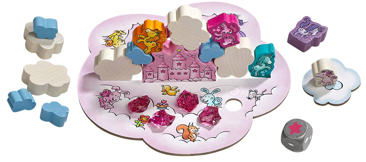 Juego cooperativo en el que por turnos se van apilando nubes y unicornios de madera sobre el castillo, o bien se colocan cristales de nube en los huecos, en función del resultado del dado. Si se logran colocar todas las piezas y cristales antes de que se descubran tres fichas de nubarrón, todos/as ganan conjuntamente.